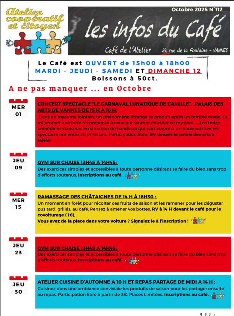 ATELIER CUISINE D’AUTOMNE A 10 H ET REPAS PARTAGE DE MIDI A 14 H : Cuisinez dans une ambiance conviviale les produits de saison pour les partager ensuite au repas. Participation libre à partir de 3€. Places Limitées. Inscriptions au café.